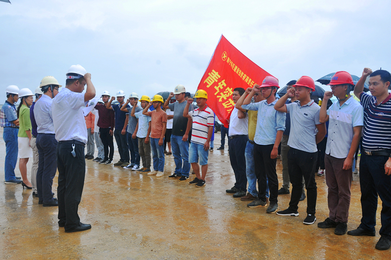 當天,細雨蒙蒙,綠港集團黨委書記、董事長、總經理龔國強在項目現(xiàn)場給參建黨員授予了“黨員先鋒隊”旗幟,給參建團員青年授予了“青年突擊隊”旗幟,綠港集團副總經理、工會主席黃麗琴給吳圩空港經濟區(qū)重點項目推進組授予了“工人先鋒號”錦旗,激勵廣大黨員干部青年同志們要以強烈的政治責任感、立足本職崗位,充分發(fā)揚不怕吃苦、勇于負重,敢打硬仗、能打硬仗的“綠港鐵軍”優(yōu)良傳統(tǒng),為吳圩空港經濟區(qū)項目建設做貢獻。