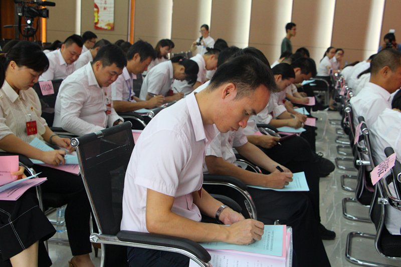 上午八點十分,大會全體工作人員提前到位,大會籌備會務(wù)組人員整齊地擺放好簽到表、出席證、嘉賓證和列席證,做好迎接大會的準(zhǔn)備。計票人、監(jiān)票人會前碰頭,明確分工任務(wù)。