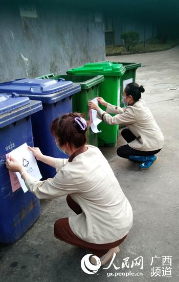 綠港集團(tuán)物業(yè)員工張貼垃圾分類標(biāo)識(shí)。朱春生攝