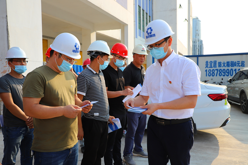 綠港集團(tuán)黨委書記、董事長(zhǎng)龔國(guó)強(qiáng)給項(xiàng)目一線人員發(fā)放《工程建設(shè)廉政手冊(cè)》(張彩秀  攝)