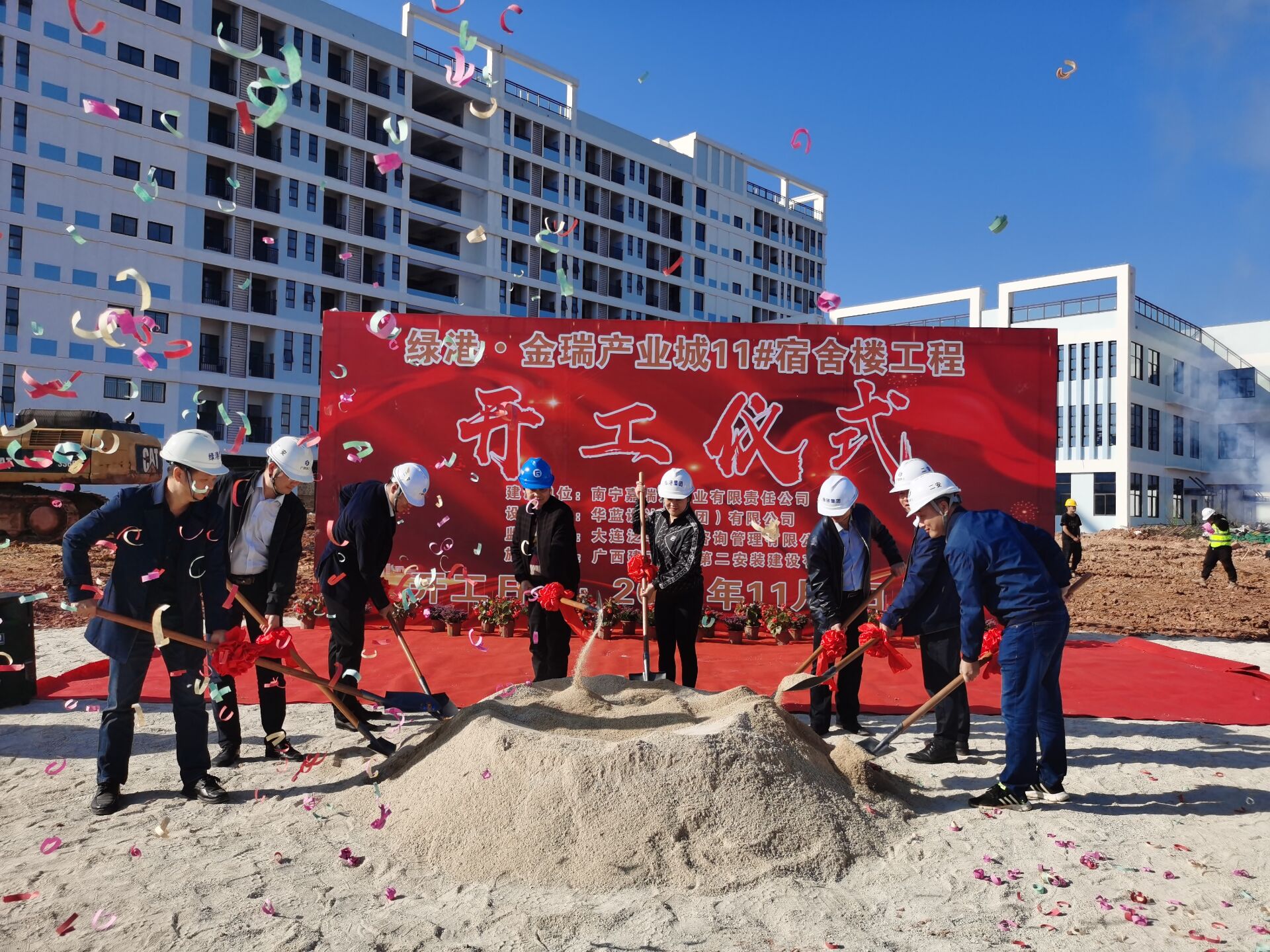 綠港·金瑞產(chǎn)業(yè)城項目位于南寧經(jīng)開區(qū)高嶺路南側(cè)、金陽路西側(cè),占地245畝,總建筑面積406039.74㎡,總投資約13億元。項目包括17個單體建筑,分三期建設(shè),一期約6.1萬㎡;二期約14.8萬㎡;三期約19.7萬㎡。目前,項目一、二期工程正如火如荼建設(shè)中,一期工程除16#污水處理廠房外,其他全部單體已拆除外架,計劃于2021年12月完工;二期工程全部單體將于11月完成主體封頂,計劃在2022年1月完工。本次開工建設(shè)的11#宿舍樓工程擬建設(shè)1棟9層宿舍樓及其他附屬配套設(shè)施,建筑面積18129.06㎡,計劃于2022年10月交付。